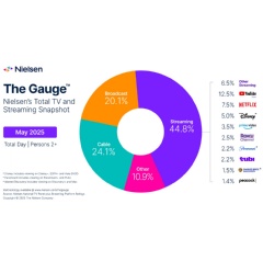 Streaming reached a historic milestone in May as its share of total television usage outpaced the combined share of broadcast and cable for the first time ever, according to Nielsen’s monthly report of The Gauge™. Streaming represented 44.8% of TV viewership in May 2025, its largest share of viewing to date, while broadcast (20.1%) and cable (24.1%) combined to represent 44.2% of TV.