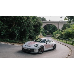 The Porsche Lëtzebuerg Legacy project is based on an example of the 911 GT3 with Touring Package. This more understated variant of the road-going sports car dispenses with the fixed rear wing and is instead fitted with a retractable rear spoiler with a Gurney flap. The model is powered by a naturally aspirated 4.0-litre boxer engine producing 375 kW (510 hp, 911 GT3 with Touring Package: Fuel consumption* combined (WLTP) 13.8 – 13.7 l/100 km, CO₂ emissions* combined (WLTP) 312 – 310 g/km, CO₂ class G , CO₂ class weighted combined G ) and a maximum torque of 450 Nm. The premiere of this very special Sonderwunsch car was celebrated at a customer event in Luxembourg on 28 June.