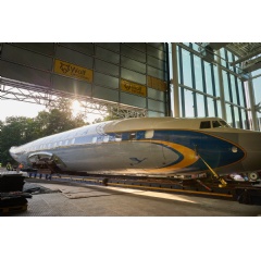 The historic aircraft, a symbol of innovation and elegance in the 1950s, has been repainted in its original livery in recent weeks. With the help of historical documents from the company archives and the expertise of Graphics Solutions, a division of Lufthansa Technik, the aircraft has been repainted in every detail. The fuselage and tail unit have now been transported to Frankfurt by heavy-duty transport. The wings are to follow next week.