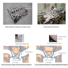 The new valve seat is produced by spraying dissimilar metal powders at supersonic speed onto the aluminum alloy cylinder head surface, forming a robust and durable coating that adheres strongly without melting the base material.