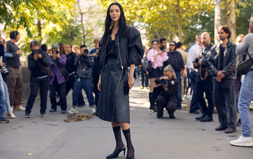 - Mariacarla Boscono - Oversized bomber jacket, belted leather-look pleated skirt and heeled leather slingbacks from H&M A/W 25.