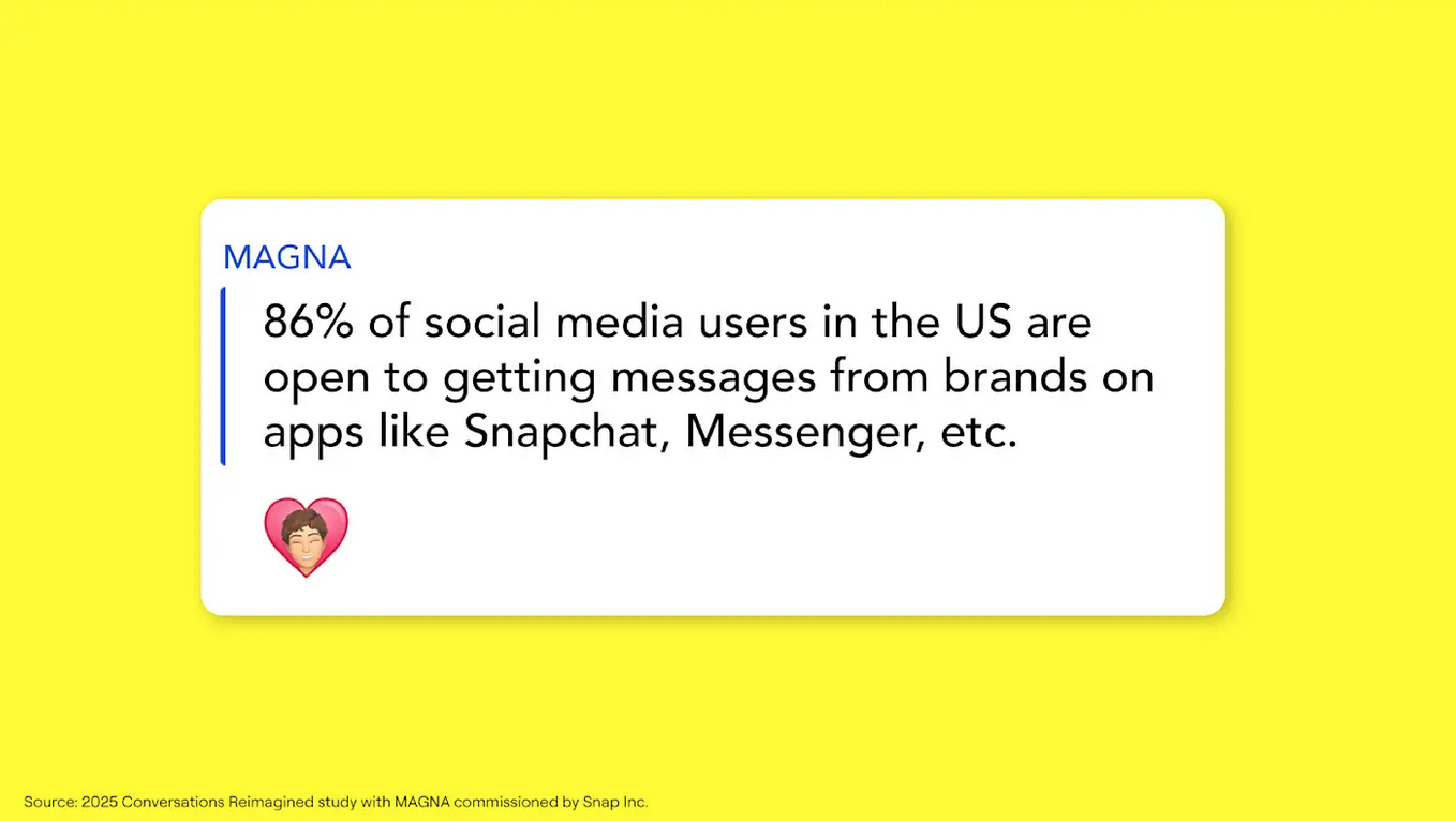 In partnership with MAGNA Media Trials, we explored how and why chat has become the most valuable space for brands, and the findings make it clear why a dedicated chat strategy is essential. Our research shows that people are not only comfortable connecting with friends in chat – they’re also open to hearing from brands there. In fact, 86% of social media users in the U.S. are open to getting messages from brands on apps like Snapchat, Messenger, and others 2 – a signal that chat has become a space for meaningful engagement.