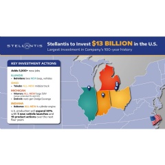 Stellantis announced today plans to invest $13 billion over the next four years to grow its business in the critical United States market and to increase its domestic manufacturing footprint. The investment is the largest in the Company’s 100-year U.S. history and will support the introduction of five new vehicles across the brand portfolio in key segments; production of the all-new four-cylinder engine; and the addition of more than 5,000 jobs at plants in Illinois, Ohio, Michigan and Indiana.