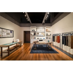 Continuing their experience, guests entered the Tailor’s Shop: a display and try-on area embodying the refined atmosphere of a modern English tailor’s boutique. Triptych mirrors allowed guests to fully appreciate the selection’s meticulous construction and thoughtful design details. Thirteen key looks were displayed, representing a full spread of the edit.