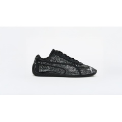 Radiant crystal detailing covers the silhouette, with PUMA’s Formstrip rendered in the empty space between 5,316 shimmering black Swarovski Crystals in four different sizes. The array of crystals was masterfully applied to the 1999 sneaker silhouette by experts from the Austrian house.