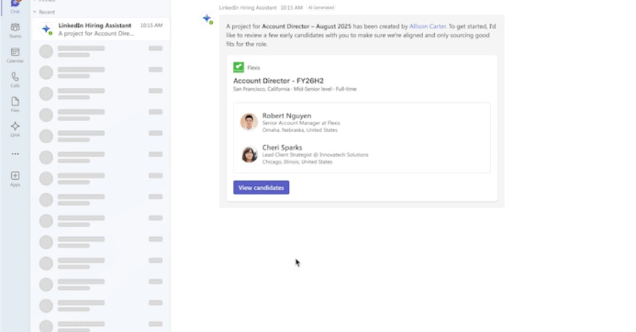 New Microsoft Teams integration to make collaboration easier: One of the most critical aspects to finding the right candidate are the conversations between the recruiter and hiring manager, but the intake process can take hours. That’s why LinkedIn is making collaboration easier by bringing Hiring Assistant into Microsoft Teams. With Hiring Assistant now in the flow of work, recruiters and hiring managers can collaborate in real time, as opposed to spending hours coordinating candidate reviews or jumping between systems. Now, hiring managers can review recommended candidates and provide feedback directly in Teams, and Hiring Assistant will adjust the search, learn from it and provide updated top candidates. Hirers will save time and can move to the sourcing stage of the hiring process even faster. It will begin rolling out to customers over the next few months.