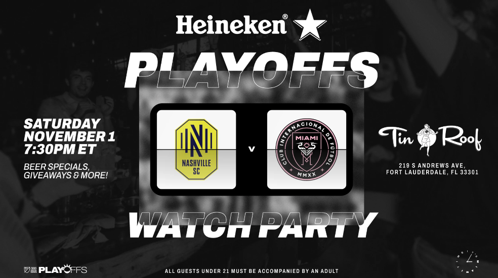 oin Inter Miami CF at Tin Roof in Fort Lauderdale this Saturday, November 1, at 7:30 p.m. ET for the Club’s official Watch Party presented by Heineken! Catch the action live as the team takes on Nashville SC on the road at GEODIS Park for Game 2 in the Round One Best-of-3 Series, as we aim to close out the series and advance to the Audi MLS Cup Playoffs Eastern Conference Semifinals.