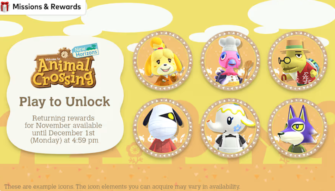 Suit up for island life! Nintendo Switch Online members can earn 100 My Nintendo™ Platinum Points* and unlock themed icon elements by playing the Animal Crossing™: New Horizons game in November, December, or January. Each month gives you different icon elements to scoop up, so keep checking in for more.