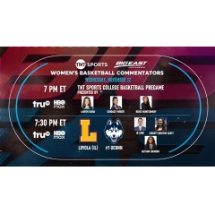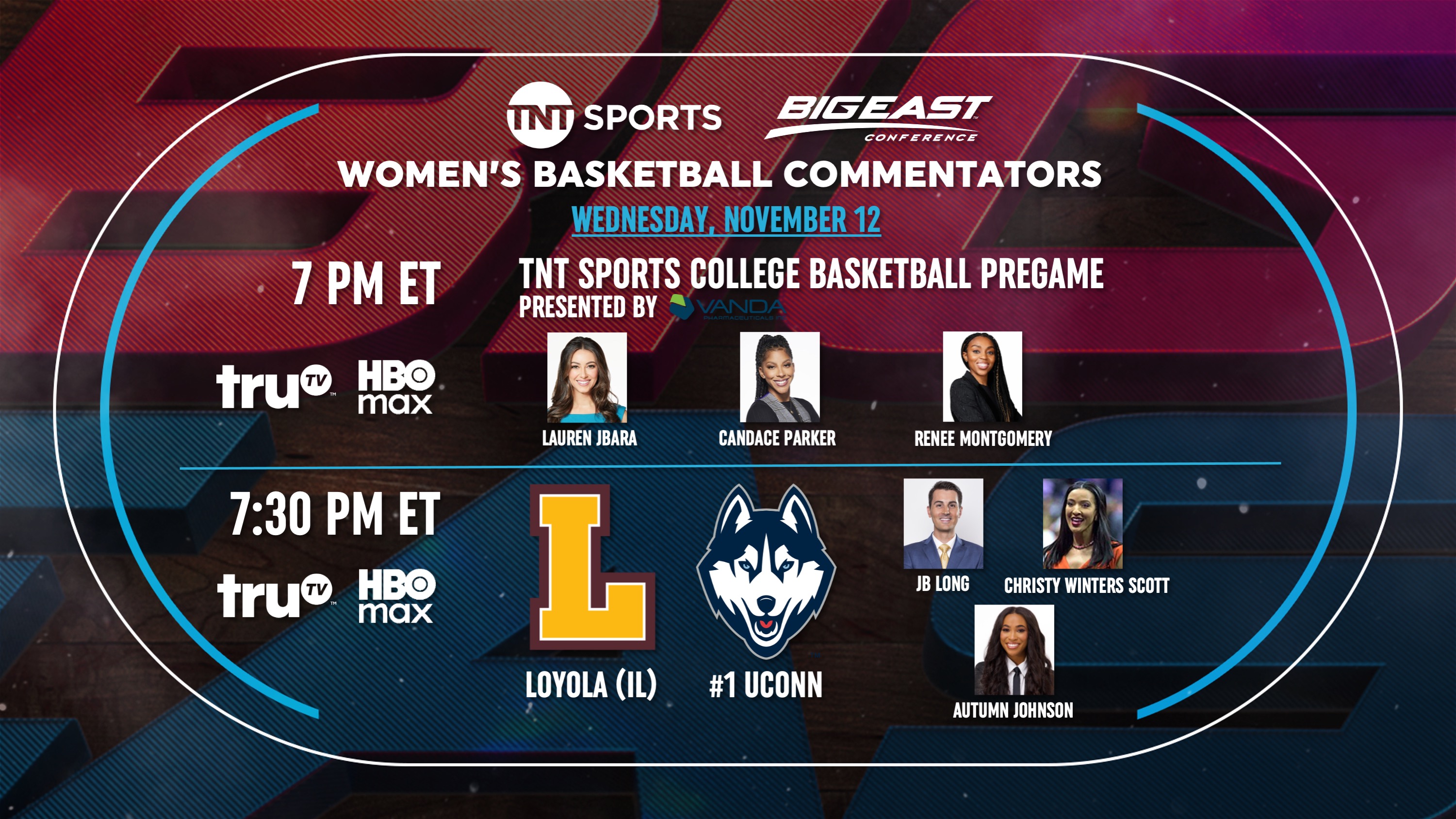 TNT Sports College Basketball Pregame presented by Vanda Pharmaceuticals will start at 7 p.m., featuring Women’s Basketball Hall of Fame Class of 2026 Inductee Candace Parker, two-time WNBA champion and 2009 NCAA champion Renee Montgomery, and versatile sportscaster Lauren Jbara, who collectively will lead TNT Sports women’s basketball studio coverage this season.