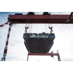 This highly precise maneuver is carried out by one of the shipyard’s two iconic gantry cranes. It consists in positioning on its keel blocks the first of the 17 sections that will form the yacht’s steel hull.