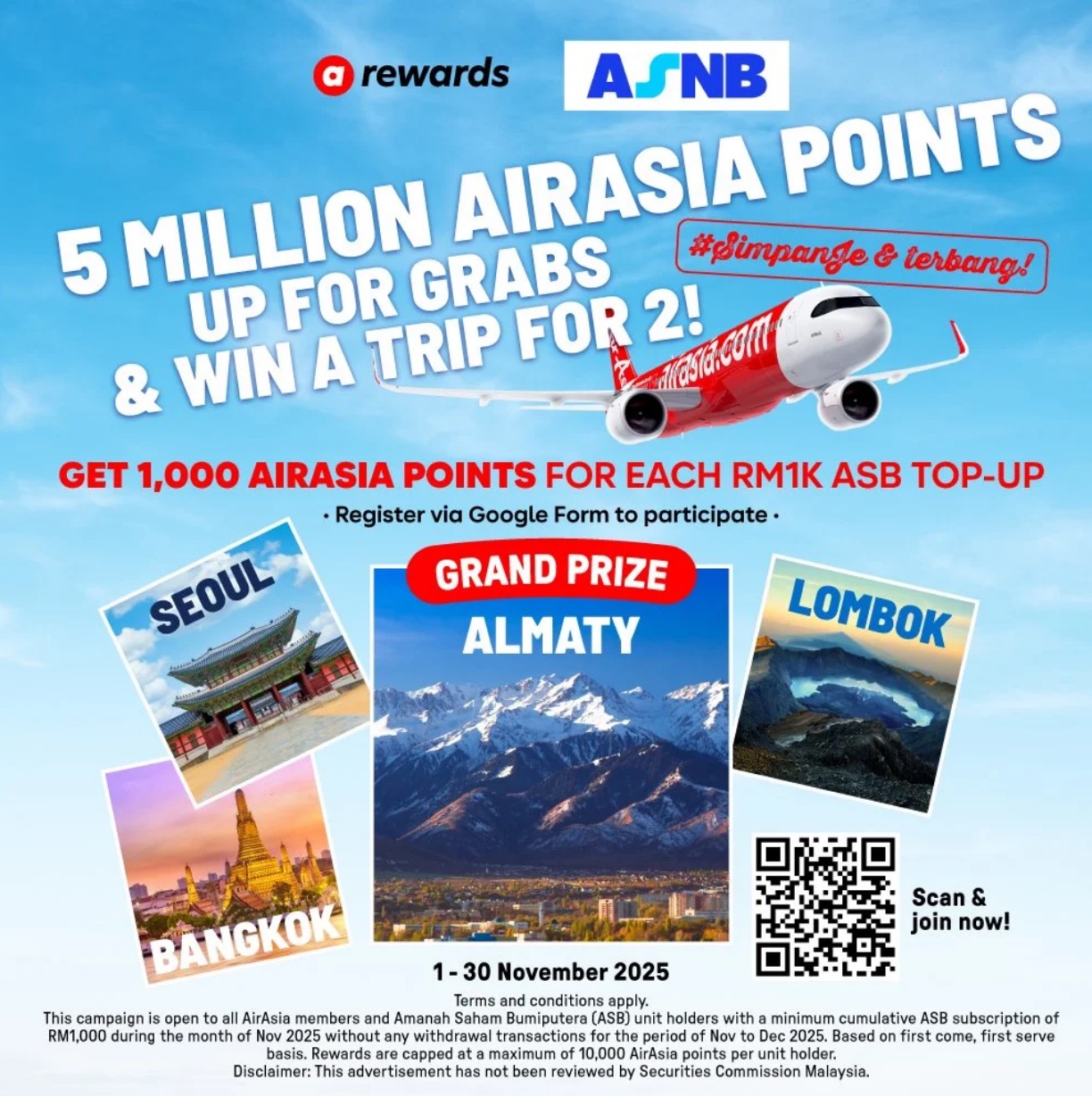 AirAsia members and ASB unit holders can now earn up to 10,000 AirAsia points when they top-up with ASNB and stand a chance to win trips to Almaty, Seoul, Bangkok, and Lombok.