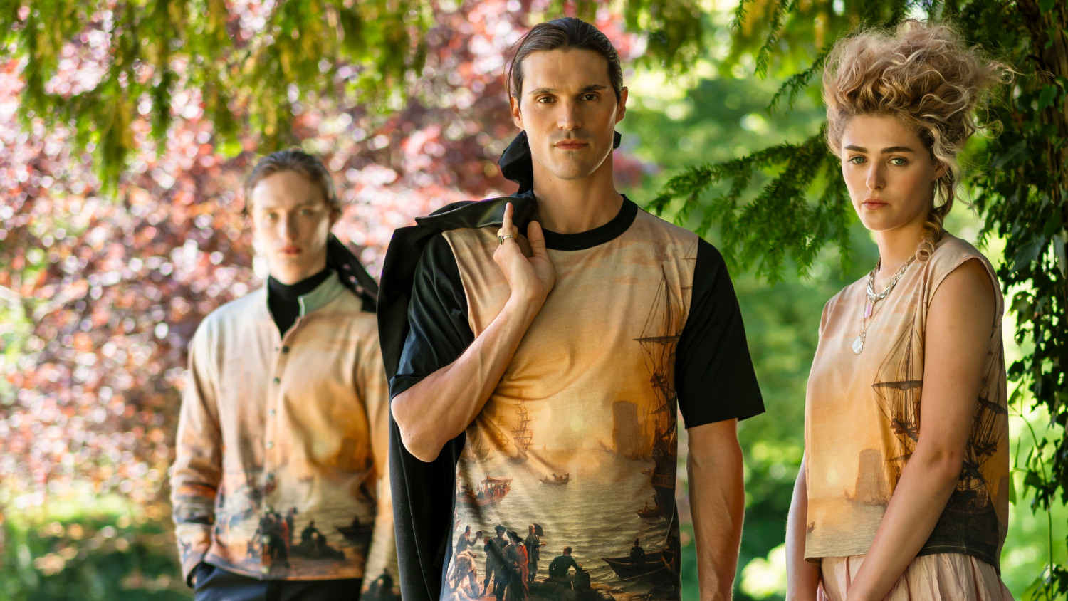 For this new collection Agnès b. chose two works by the French classicist painter Claude Lorrain, famous for his imaginary landscapes inspired by the Roman countryside and classical mythology. She also pays tribute to the work of an artist who made light a central theme of his studies and influenced some of the greatest names in art history, from Turner to the Impressionists. Seaport at Sunset and Landscape with Shepherd are a complementary pair of paintings: azure sky and ruddy peaks; a river winding towards the depths of a valleyed landscape and a seaport where ships meet the horizon. Ever fascinated by sea and oceans, but also by the promise of the beyond, Agnès b. saw in them her own creative spirit, cultivating a waft of reverie, a sense of depth, a touch of mystery and a harmonious balance.
