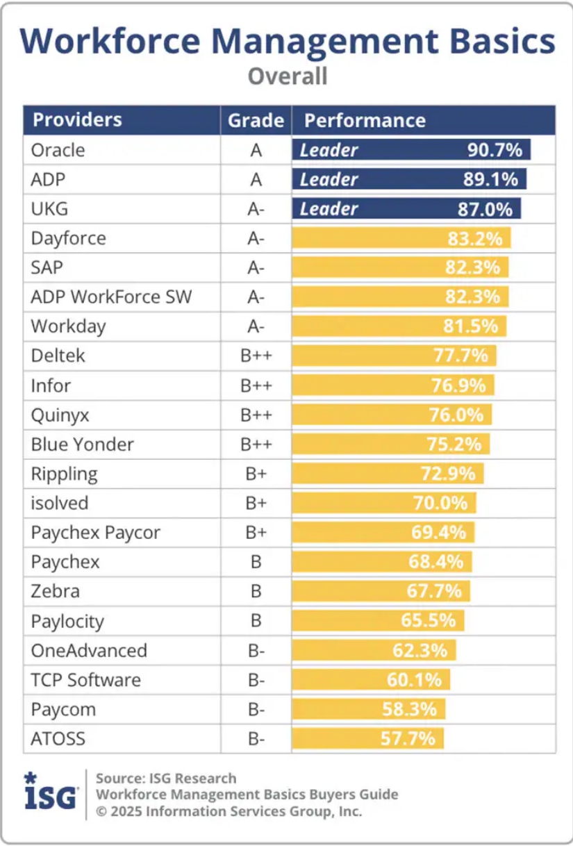 At Oracle, we understand the complexity of this challenge and are committed to helping our customers unlock the full potential of their workforce. That’s why I’m proud to share that Oracle has been recognized as an Overall Leader in the 2025 ISG Buyers Guide™ for Workforce Management Basics.