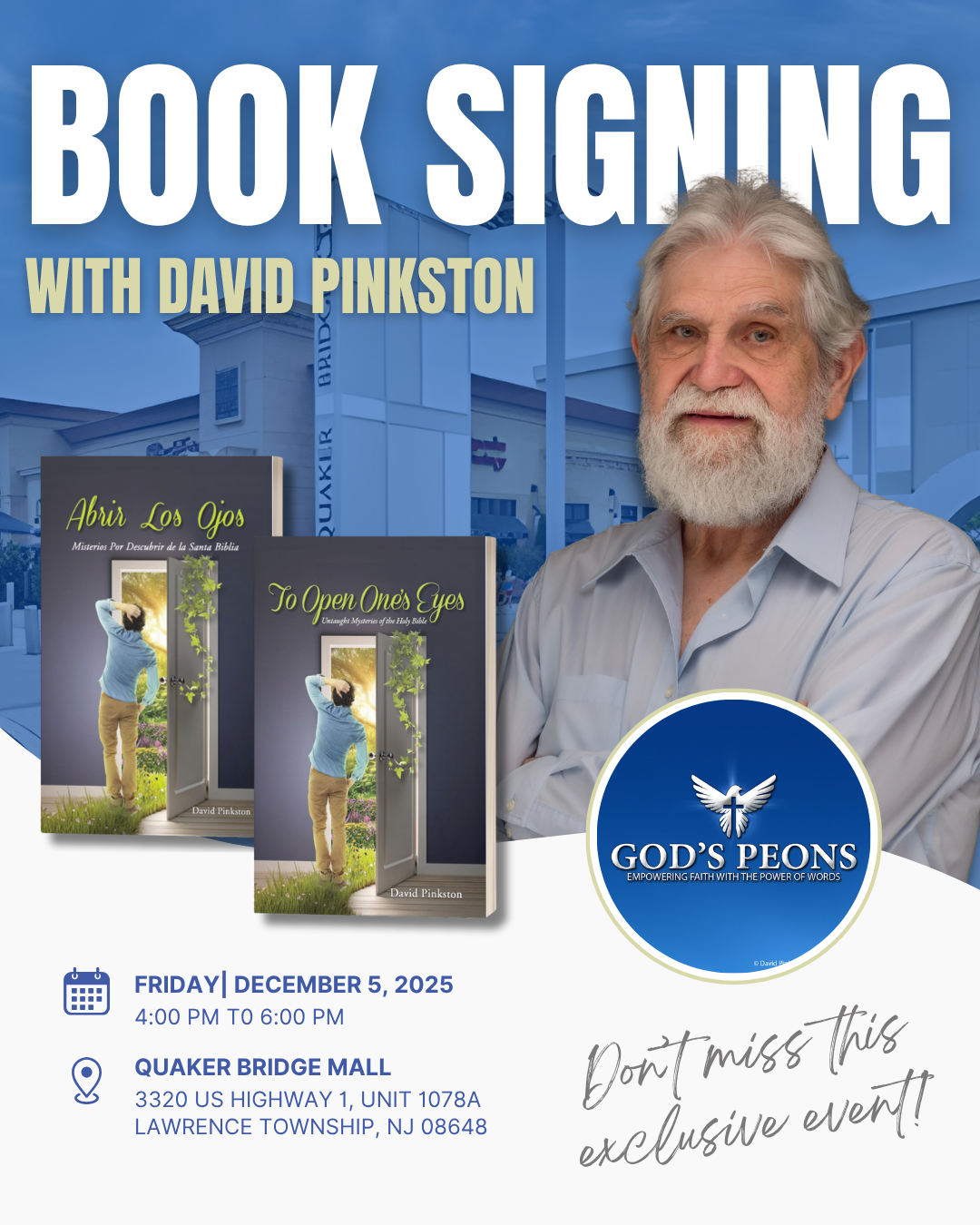 The Reading Glass Books (RGB) is honored to welcome independent Bible scholar and U.S. Army Special Forces veteran David Pinkston for a special signing of his book “To Open One’s Eyes,” at RGB’s bookstore in Quaker Bridge Mall, on December 5, 2025 from 4:30 to 6:30 P.M.