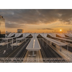 Next to the platforms is a new station building featuring a spacious main hall and a modern commercial corridor filled with shops and restaurants. A significant aspect of the modernization is Level -1, an underground passageway that is 63 meters wide. Designed with sustainability in mind, the station is equipped with a photovoltaic installation covering over 8,000 square meters, enabling the facility to generate approximately 30% of its own electricity needs.