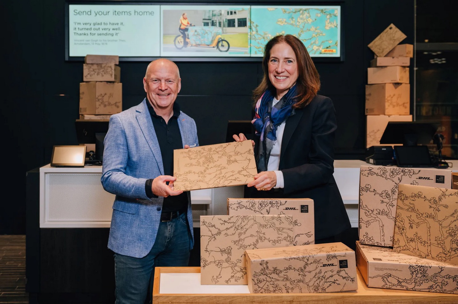 All orders are now sent in sustainably produced boxes and envelopes, featuring Van Gogh’s Almond Blossom. DHL couriers are highly visible while making their rounds, due to the remarkable DHL x Van Gogh Museum delivery bikes. Visitors can now have their souvenirs from the Museum Shop shipped worldwide from the DHL Express Service Point in the museum.