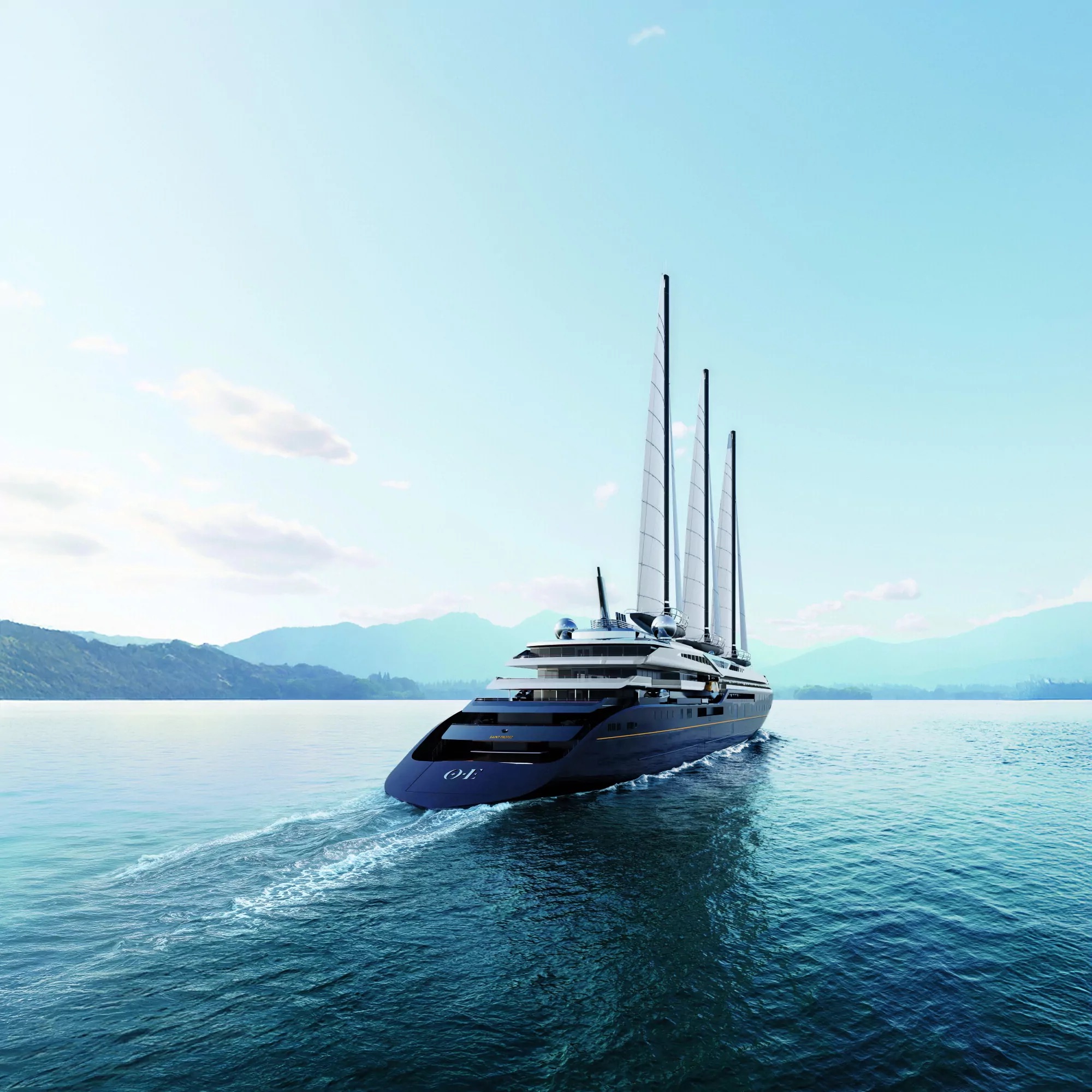 The result of an exceptional French partnership between Accor, world leader in hospitality, and Chantiers de l’Atlantique, a global pioneer in cruise-ship construction, Orient Express Corinthian and Orient Express Olympian are two visionary sailing yachts combining avant- garde design and spectacular interiors. Drawing from offshore-racing expertise, both will be powered by the revolutionary SolidSail technology: three rigid sails of 1,500 m2 each, mounted on tilting masts rising over 100 meters high, enabling up to 100 % sail propulsion in favourable wind conditions.