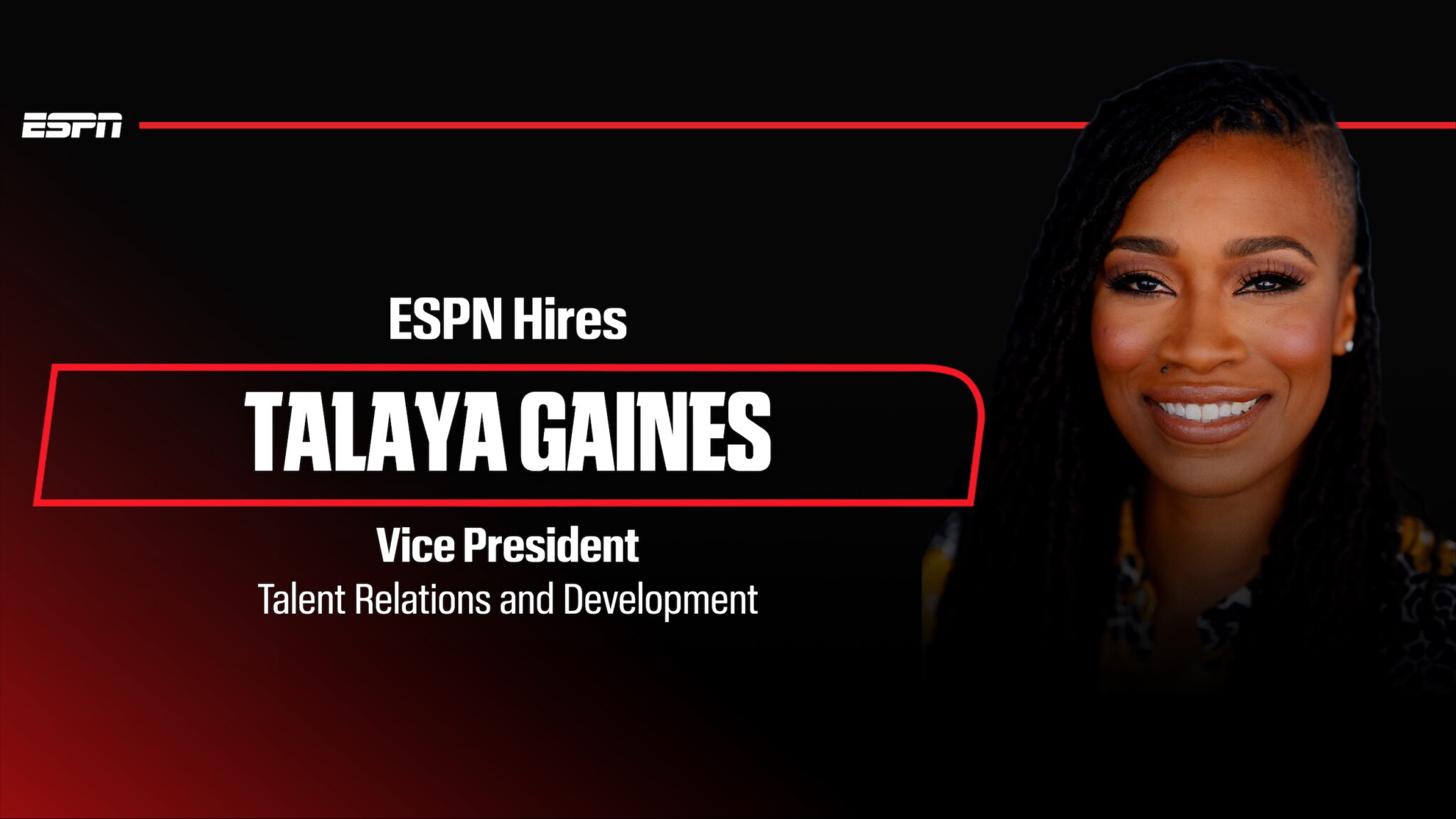 ESPN today announced it has hired three-time Emmy Award-winning sports media executive Talaya Gaines as Vice President, Talent Relations and Development. The 18-year industry professional returns to ESPN after serving as Vice President, Content Strategy and Original Programming for MSG Networks. Gaines had previously spent 14 years at ESPN, most recently as Managing Producer, ESPN+ and Original Content. She begins her new role on January 5.
