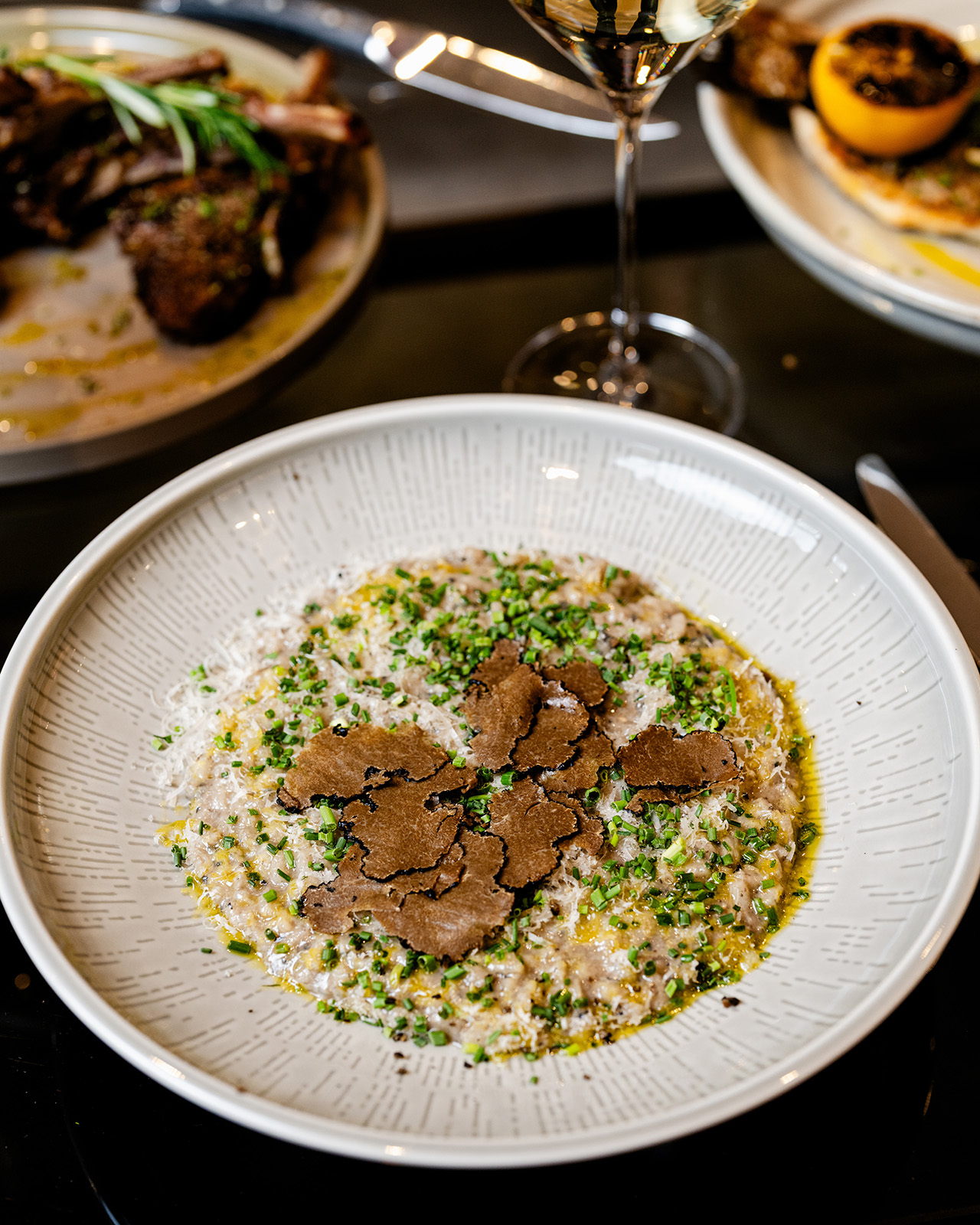 For the entrée, guests may select from Slow-Roasted Winterfrost Wagyu Picanha served with celery root pavé and black garlic chimichurri; Striped Sea Bass presented with Kuri squash broth, kalette, ginger vinaigrette, pickled shrimp, and fennel salad; Black Truffle Risotto; or Duck Leg Confit accompanied by pickled fig, lavender jus, bee pollen, and nasturtium.