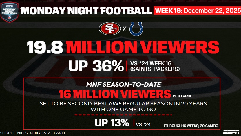 Monday Night Football’s 49ers-Colts Matchup Draws 19.8 Million Viewers; Up 36% vs. 2024 Week 16