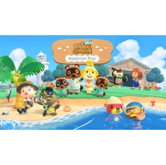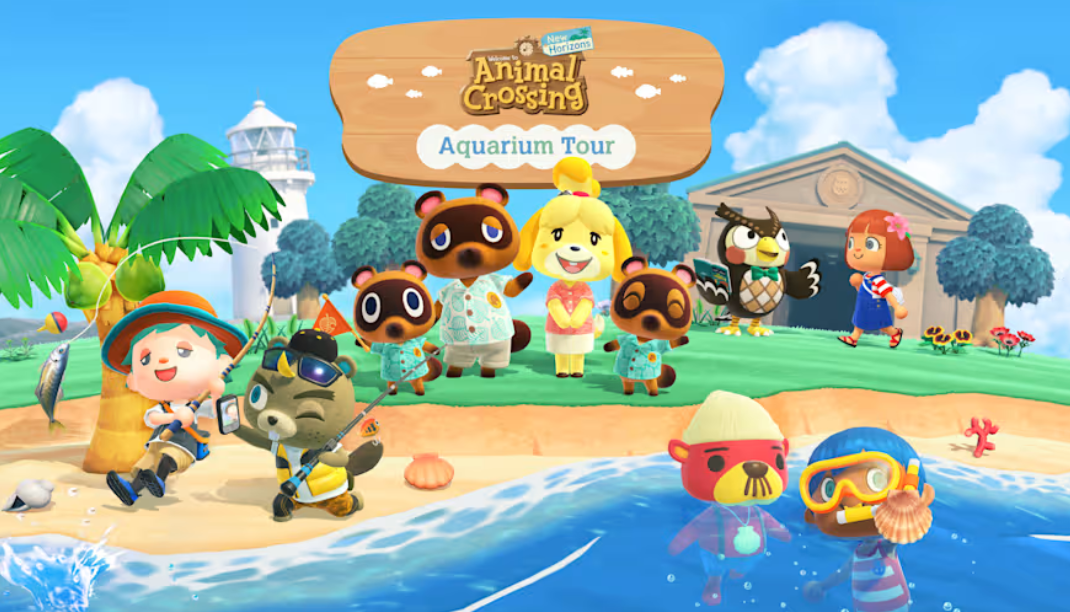 - Photo opportunity featuring an aquarium-themed background with characters from the Animal Crossing: New Horizons game.
