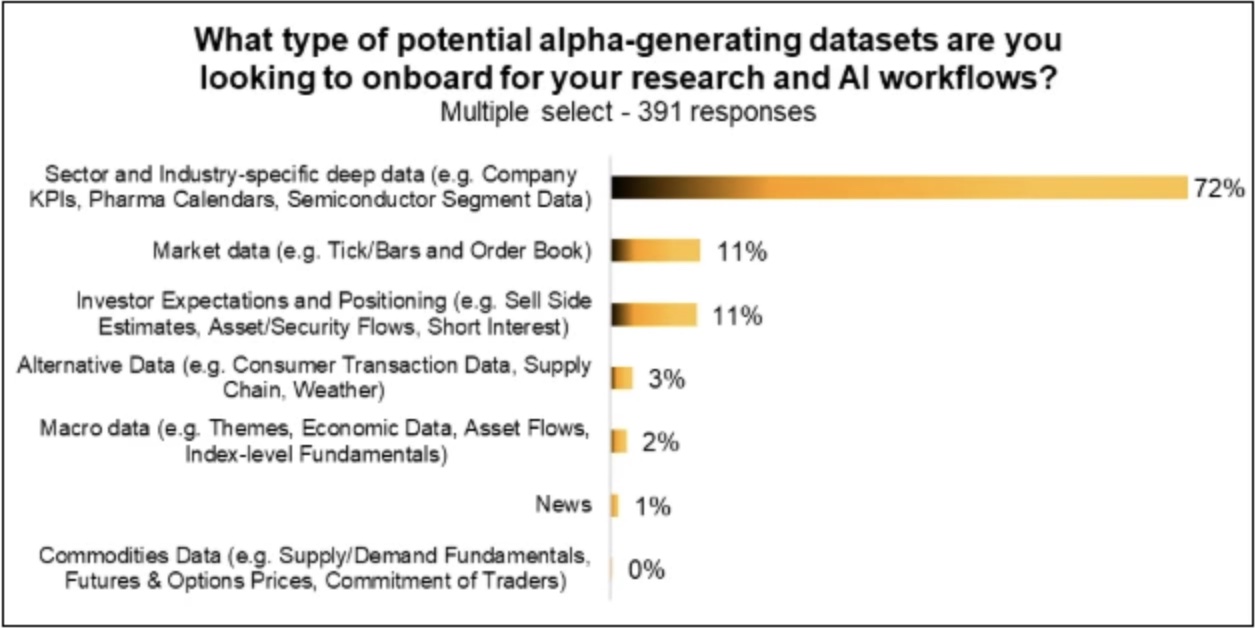 As firms look ahead to more AI-enabled deep research to support more specialized, domain-driven strategies, nearly three-quarters of respondents (72%) say they want to onboard sector and industry-specific data, such as company key performance indicators, pharmaceutical pipeline, and semiconductor segment revenue mix.