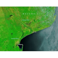The MODIS (Moderate Resolution Imaging Spectroradiometer) on NASA’s Aqua satellite captured this false-color image (bands 7-2-1) of floodwaters coursing down the two rivers on January 25, 2026 (right). The image on the left, captured by the Terra satellite, shows the same area on December 17, 2025, before the flooding. A natural-color version of the image shows thick plumes of water rich in suspended sedimentflowing down the rivers and into the Mozambique Channel.