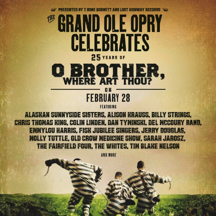 The Grand Ole Opry will host a 25th anniversary celebration for the 8x Platinum O Brother, Where Art Thou? soundtrack on Sat. February 28. The special Opry show will feature artists from the original soundtrack and more including Alaskan Sunnyside Sisters, Alison Krauss, Billy Strings, Chris Thomas King, Colin Linden, Dan Tyminski, Del McCoury, Emmylou Harris, Fisk Jubilee Singers, Jerry Douglas, Molly Tuttle, Old Crow Medicine Show, Sarah Jarosz, The Fairfield Four, The Whites, and Tim Blake Nelson.
