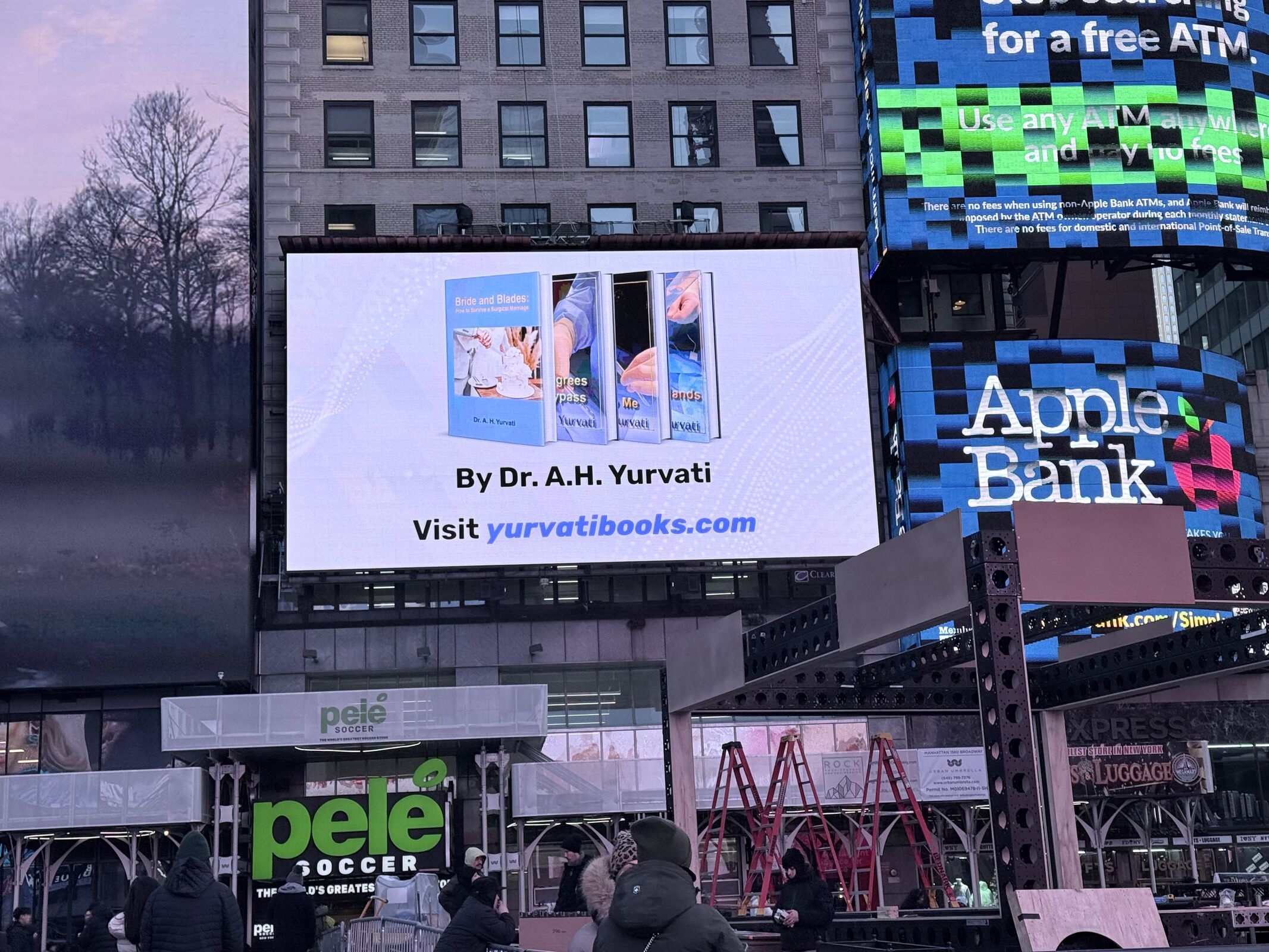 Dr. Albert H. Yurvati, emeritus professor at the University of North Texas Health Science Center and celebrated cardiothoracic surgeon, has achieved a new milestone: all four of his books are now featured on a Times Square billboard in New York City. The display highlights his memoirs—Wet My Hands, This to Me, 30 Degrees on Bypass—as well as his guidebook Bride and Blades: How to Survive a Surgical Marriage.