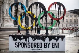 Greenpeace Italy activists placed a large installation depicting the Olympic Rings dripping oil and the words “Sponsored by Eni” in Piazza Duomo in Milan, where the Olympic flame is expected to arrive today.