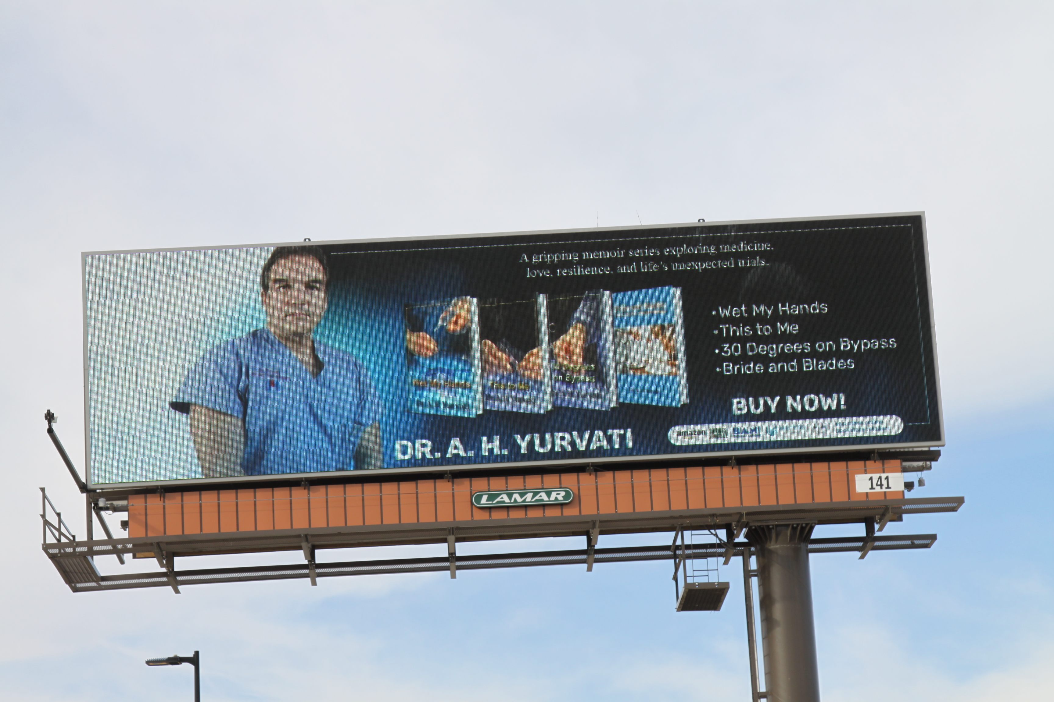 Dr. Albert H. Yurvati’s four compelling memoirs were prominently featured on a billboard along Golden Triangle Boulevard in Keller, Texas, captivating readers and passersby alike. The billboard highlighted Dr. Yurvati’s acclaimed works: “Wet My Hands,” “This to Me,” “30 Degrees on Bypass,” “Bride and Blades,” each offering a unique perspective on medicine, life, and human resilience.