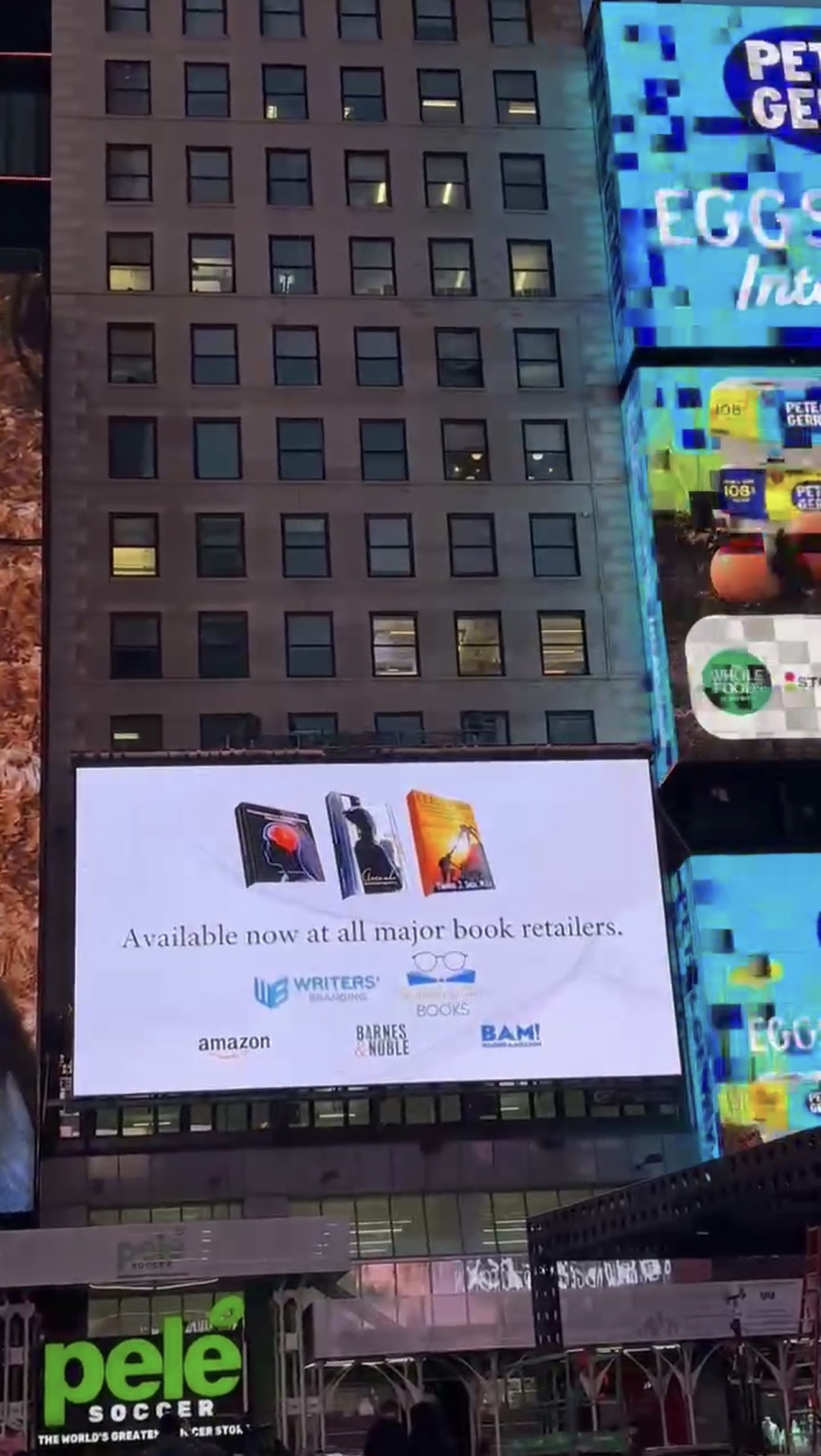 Authors Judy Beezley, Thomas Snee, and Amy Twilegar were prominently featured on a major Broadway billboard located at 1560 Broadway, between 46th and 47th Streets, directly above the Pelé store in the heart of Times Square. The high-visibility placement positioned their books before a national and international audience, capturing the attention of millions of pedestrians, commuters, and visitors in one of the world’s most iconic media corridors.
