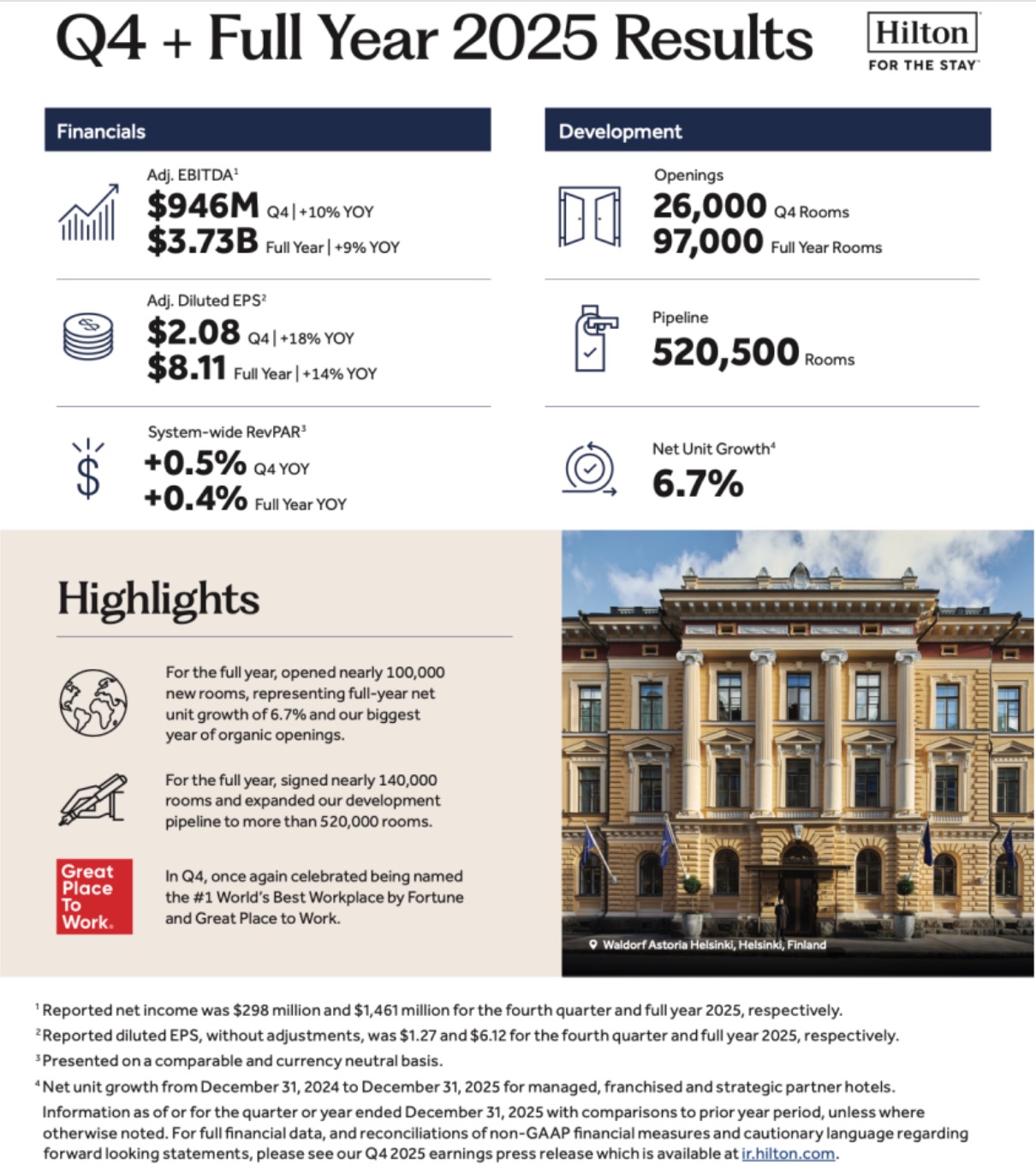 Hilton Worldwide Holdings Inc. (“Hilton,” “the Company,” “we,” “us” or “our”) (NYSE: HLT) reported its fourth quarter and full year 2025 results. Highlights include: