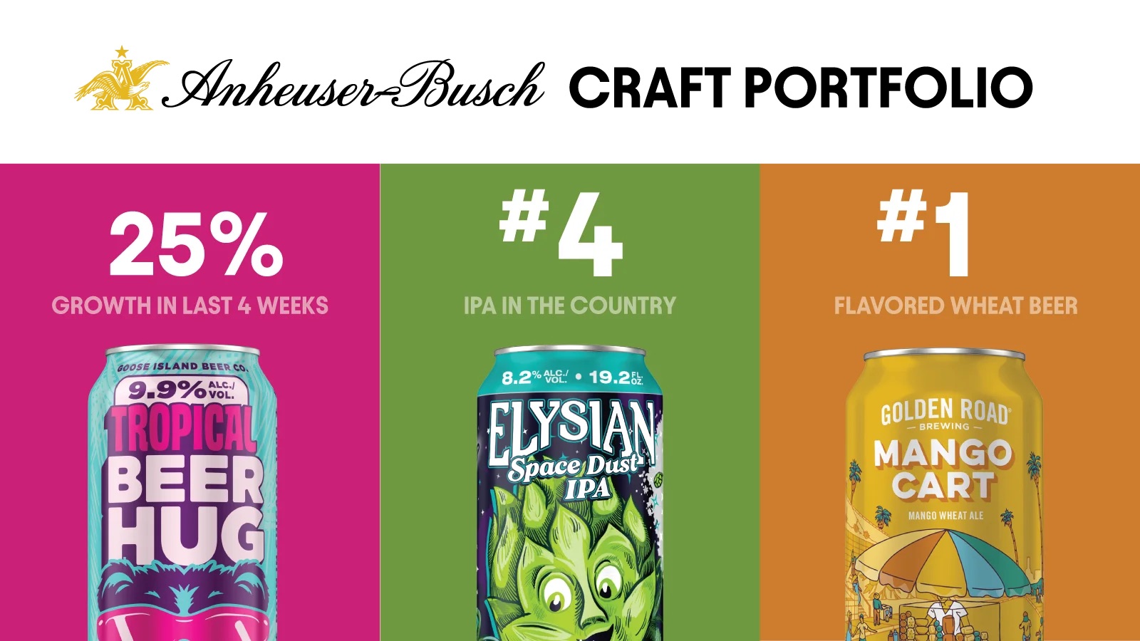 A-B has continued its growth into 2026 leading with its craft scale brands – Goose Island Beer Hug IPA, Goose Island IPA, Elysian Space Dust IPA, Golden Road Mango Cart and Wicked Weed Pernicious IPA — which are already up +11.9% so far this year 2 collectively.
