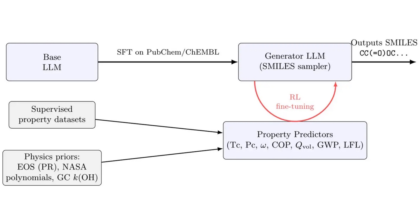 - Reinforcement learning guides the generator toward molecules that simultaneously balance efficiency, ideal critical temperature, appropriate size, low greenhouse warming potential, and safety. All of these predicted properties are then used to simulate the candidate’s efficiency in standard refrigeration equipment.