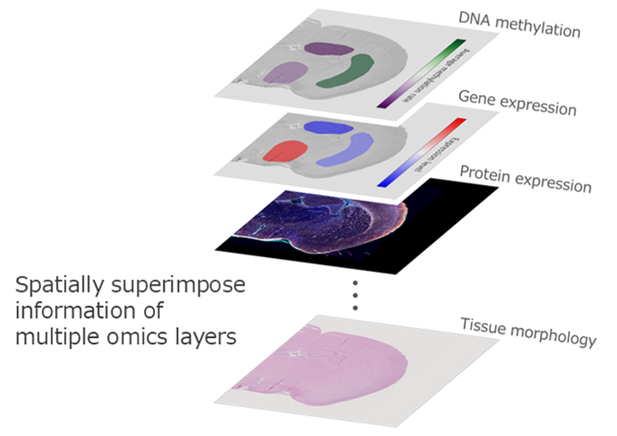 This software technology enables researchers to visualize and analyze multiple types of omics information, such as DNA methylation *2 and gene and protein expression, along with the spatial information of biological samples (locations and morphological characteristics within the sample). This allows researchers to study the causes and mechanisms of complex diseases, such as cancer, considering that many factors are involved in multiple stages and the disease can develop and spread heterogeneously.