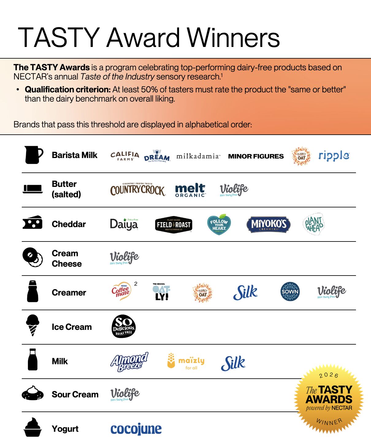 To celebrate achievements in taste innovation, NECTAR is recognizing the top-performing brands from this study with a TASTY Award. The awards honor brands that have achieved taste excellence, where at least 50% of consumers rated the alternative product as good as or better than its dairy counterpart in overall liking.
