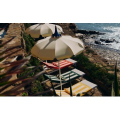 The striped towels come with matching robes, perfect after a morning swim. The collection beach bags are available in a variety of styles – from the classic off-white cotton tote with black handles, to the white and blue striped canvas bag or a mesh tote available in a straw or black colour. Great for a beach excursion or your own at-home beach club, the collection also features striped deck chairs in grey/white or white/blue, a backgammon set that comes in two colours, a beach tennis set and a two deck playing card set in a wooden box in addition to two parasols matching the deck chairs, striped with fringe detailing.