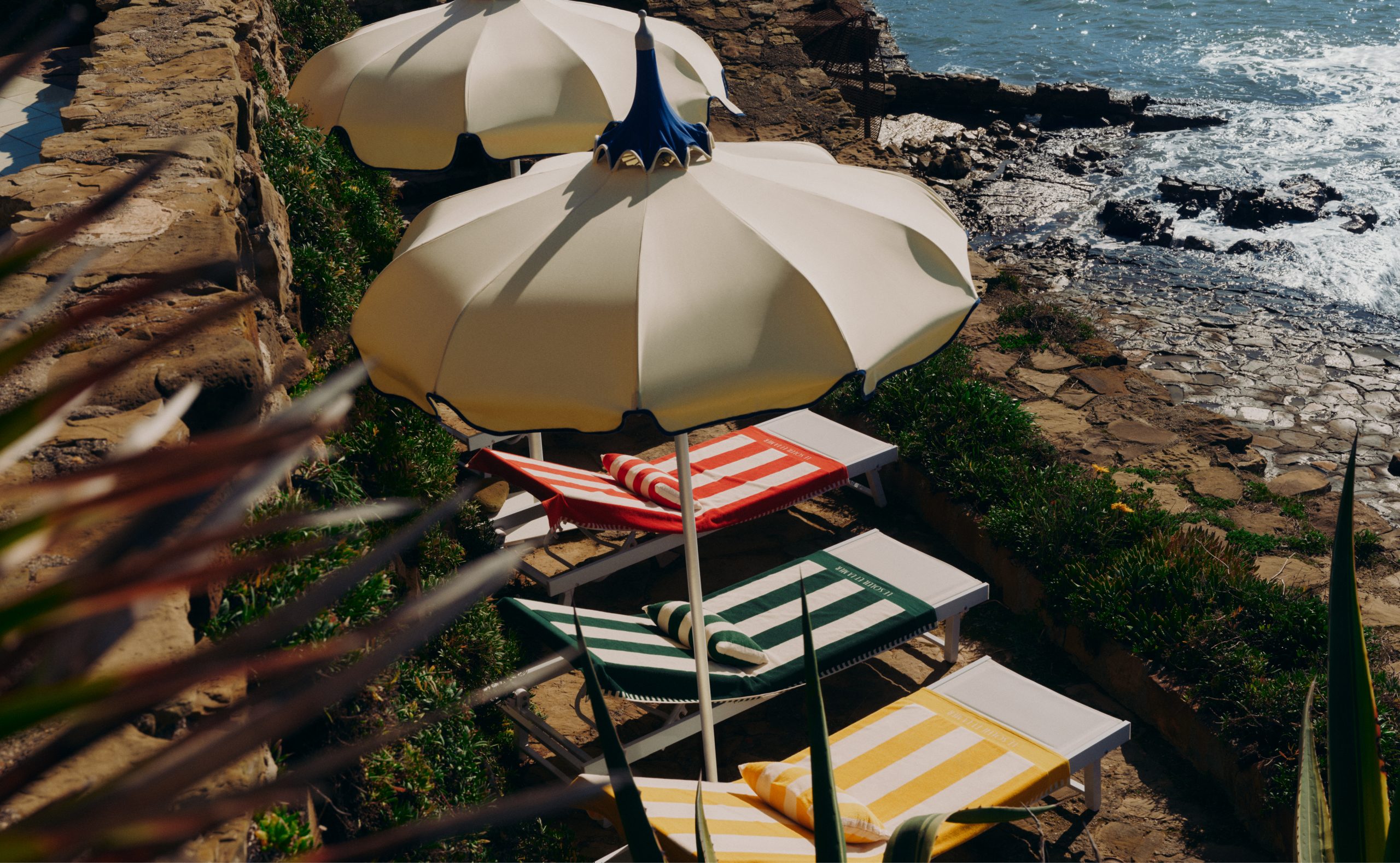 The collection centres around the striped towels and matching beach pillows – soft terry in blue, yellow, green and red, in addition to the riviera-themed towels in blue, green and yellow. These are branded with Capri, Nice and Sicily and can be matched with branded cotton beach pouches to carry and protect all summer essentials – an homage to iconic Mediterranean summer spots.