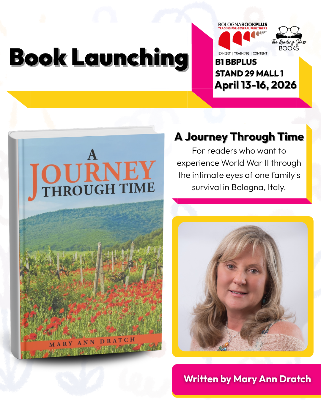 The Reading Glass Books is proud to present a special showcase of Mary Ann Dratch’s novel “A Journey Through Time” at Hall 29, Mall 1 - Stand B1 at BolognaBookPlus 2026 in Bologna, Italy, from April 13 to 16.