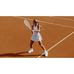Key pieces embody this duality of fashion and function. A sleeveless tennis dress with a drop waist flows gracefully with the body, while a pinstripe bubble-hem miniskirt allows freedom of movement in every serve and lunge. Bras and tanks with sweetheart necklines and cross over straps flatter without sacrificing support, and slim-fit jackets layer effortlessly over court-ready sets.
