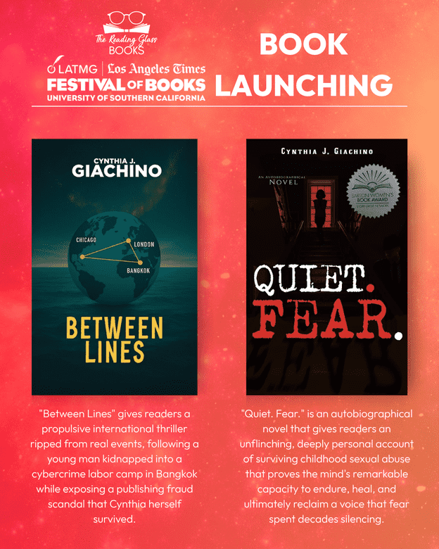 The Reading Glass Books is excited to feature the novels of Cynthia J. Giachino at Booth #960 in the Black Zone at USC during the LA Times Festival of Books on Sunday, April 19, 2026.