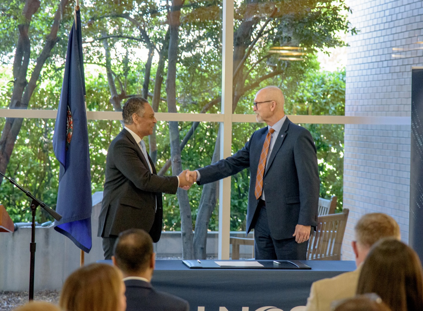 Mark Johnson, left, interim CEO of UNOS, and John Koelling, director of the Aeronautics Research Directorate at NASA’s Langley Research Center, shake hands during a signing ceremony marking an agreement to study drone transport for organs.Photo courtesy of UNOS