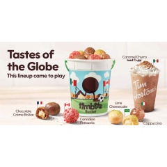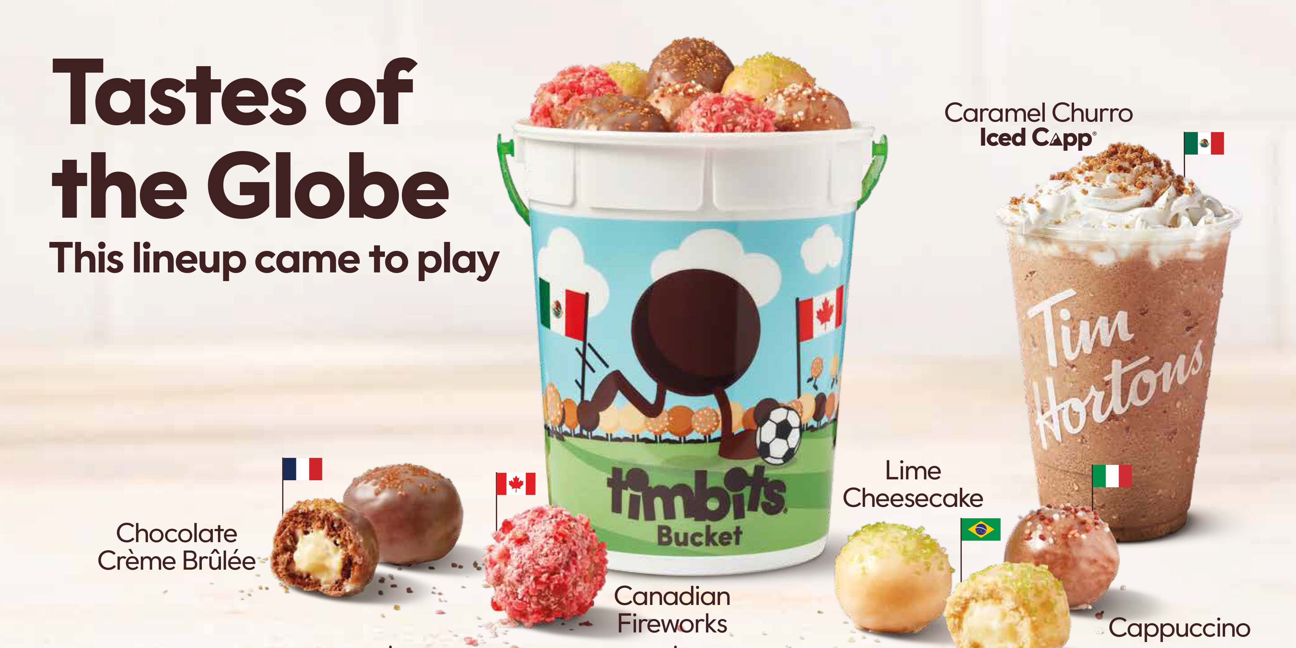 - Starting today, guests can pick up a new soccer-themed Timbits Bucket and try the new Tastes of the Globe lineup of Timbits flavours, which is inspired by iconic flavours from around the globe that are loved by Canadians. New soccer-themed drinkware and merchandise are also coming soon to Tims® restaurants and TimShop.ca.
